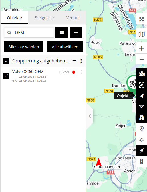 Wenn keine Objekte auf der Karte sichtbar sind, kann es daran liegen, dass die Option „Objekte“ auf der rechten Seite deaktiviert ist. Aktivieren Sie diese Option erneut mit dem Pfeil, um die Objekte wieder anzeigen zu lassen. Außerdem muss das Objekt in der Liste ausgewählt sein.